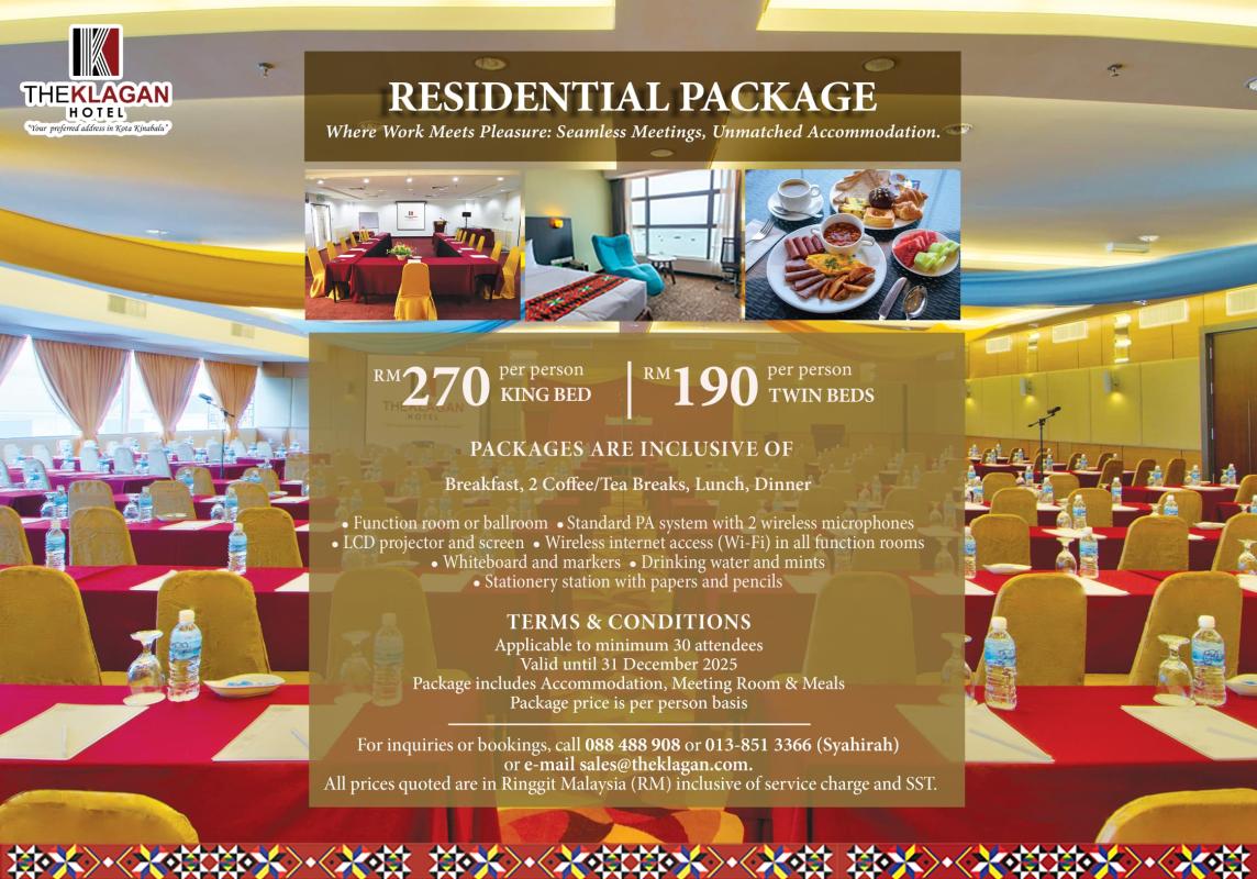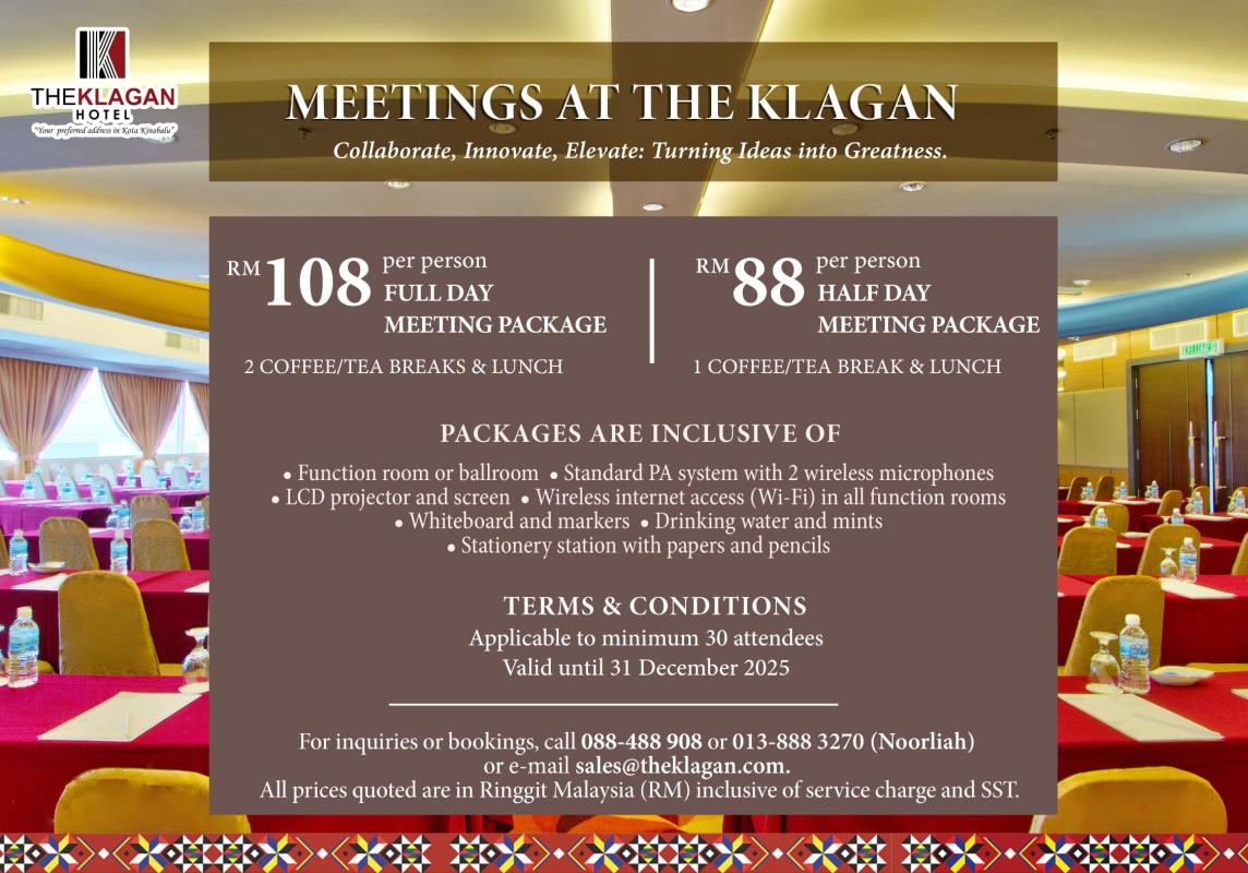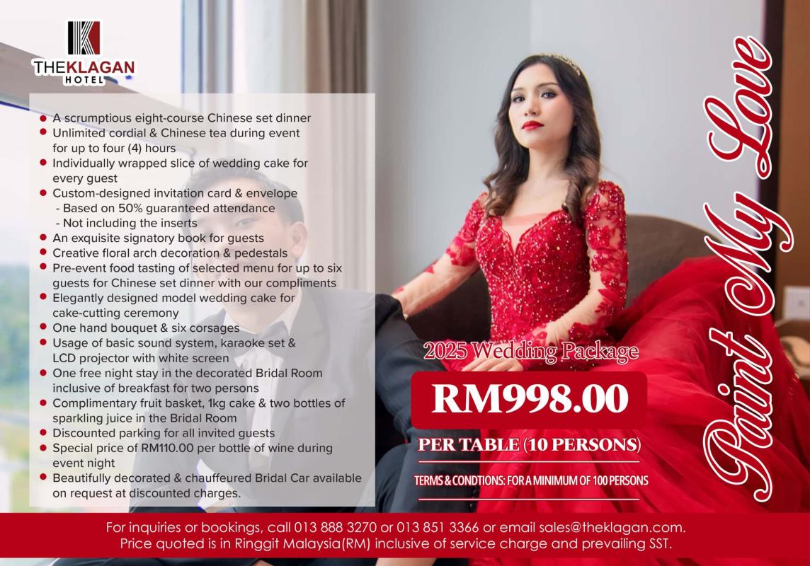 Promotions Meetings, Banquets, Weddings and Annual Dinner packages 2025 Wedding Package 2025 Akad Nikah Package Meetings at The Klagan Residential Package Best Deal, Any Day! The Klagan Hotel Warisan Square & The Klagan Riverson