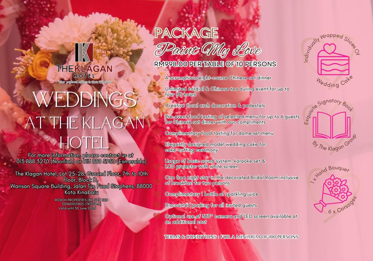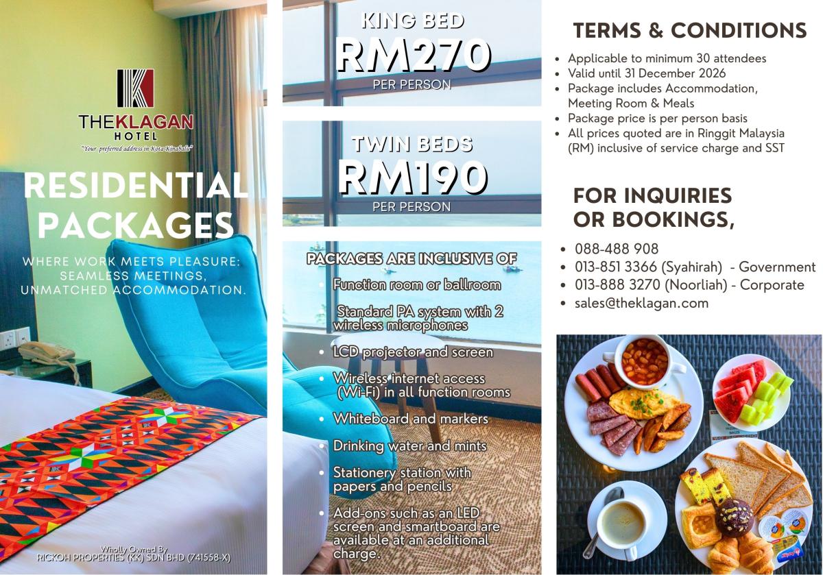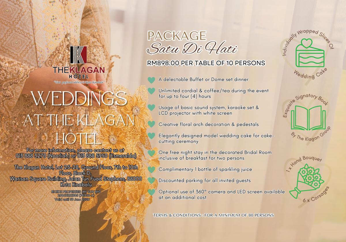 Promotions Meetings, Banquets, Weddings and Annual Dinner packages 2026 Wedding Package 2026 Akad Nikah Package 2026 Meeting Package 2026 Residential Package The Klagan Hotel Warisan Square & The Klagan Riverson
